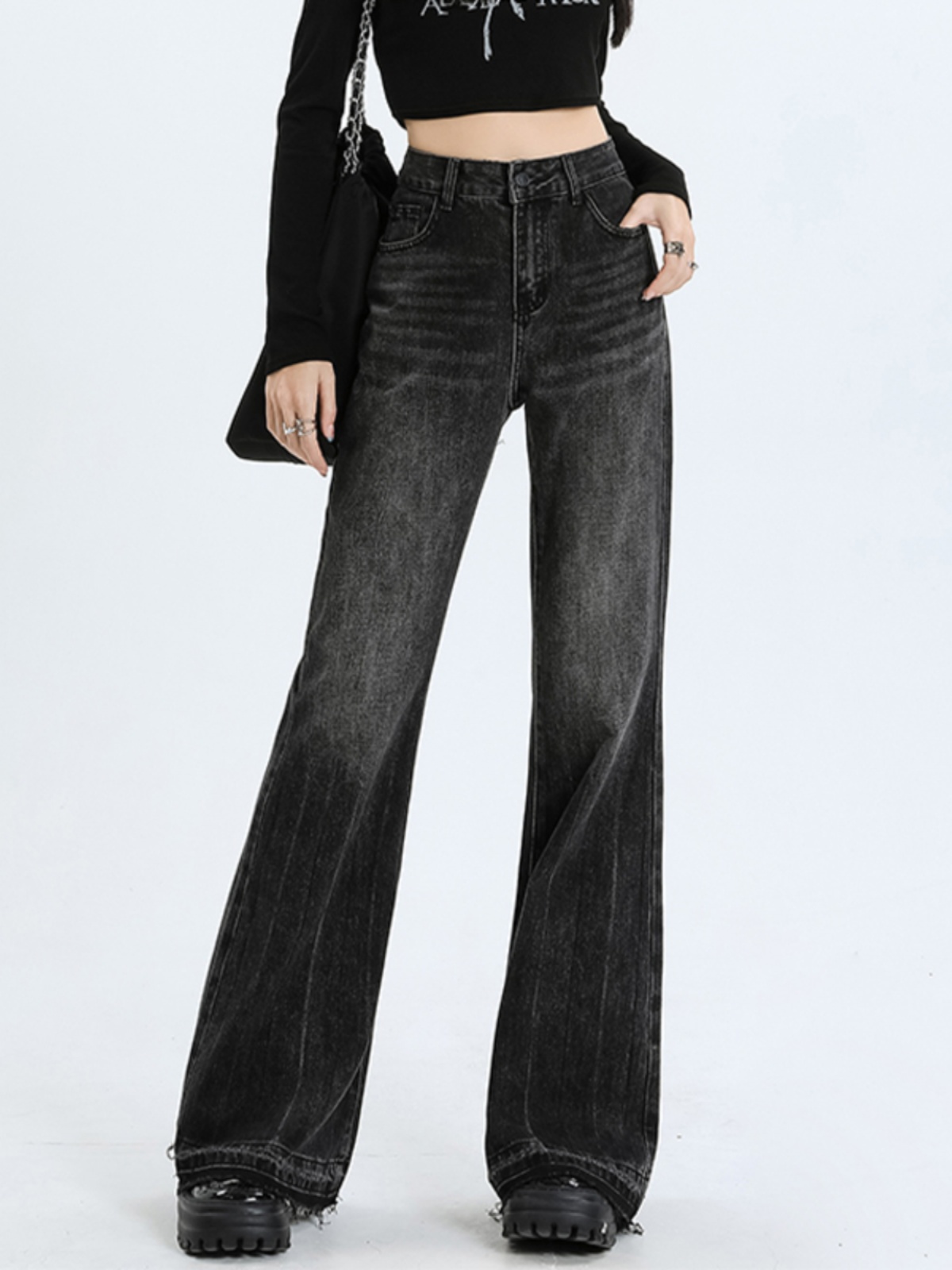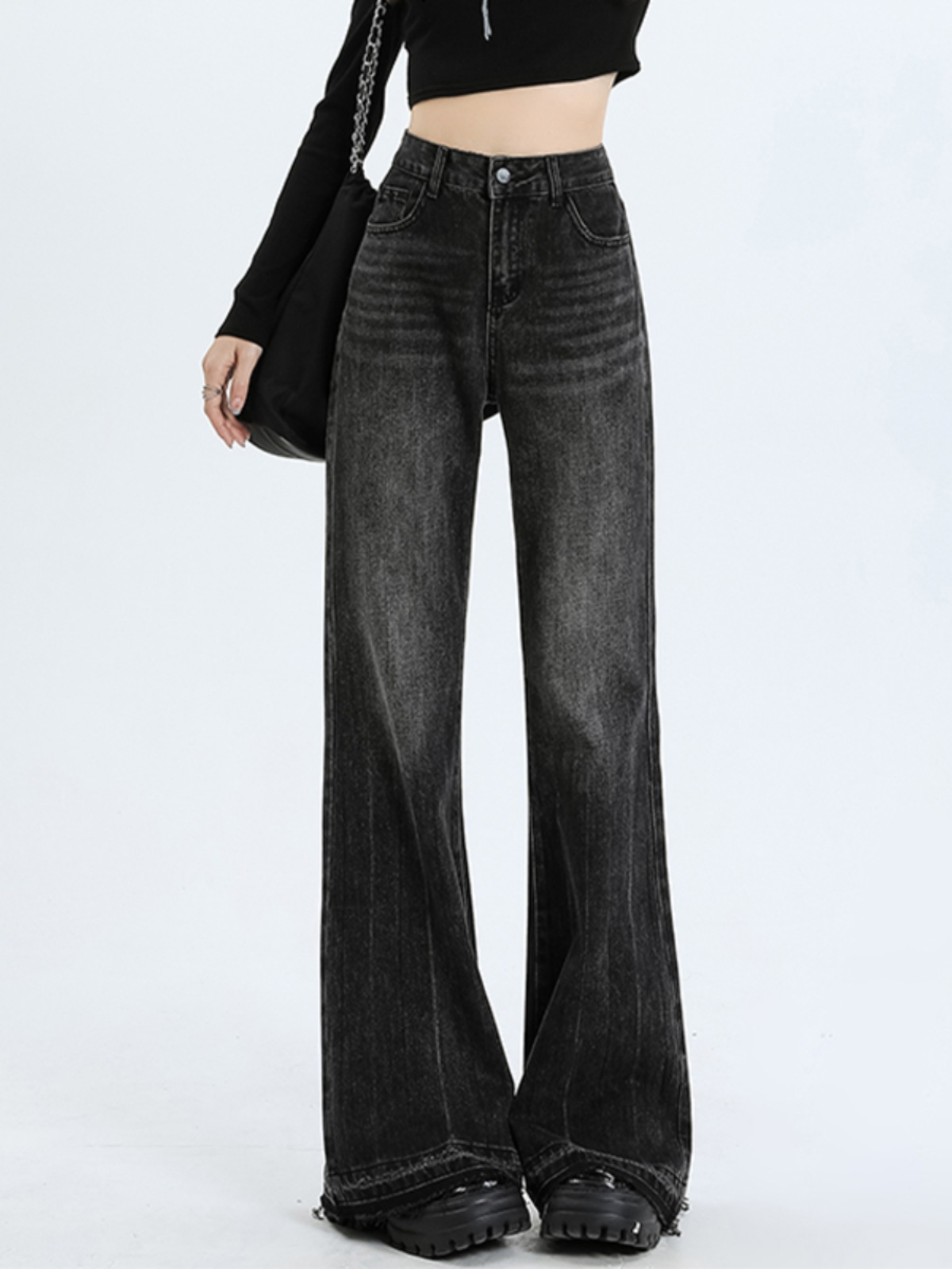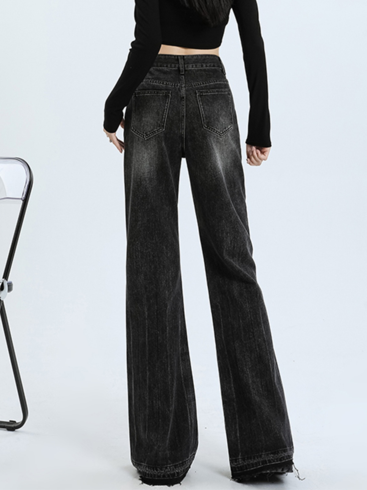 Американский уличный стиль, черные джинсовые брюки Weila, женские, осенние, сексуальные, с высокой талией, стройнящие, прямые, широкие штанины, с необработанным краем, брюки-моп