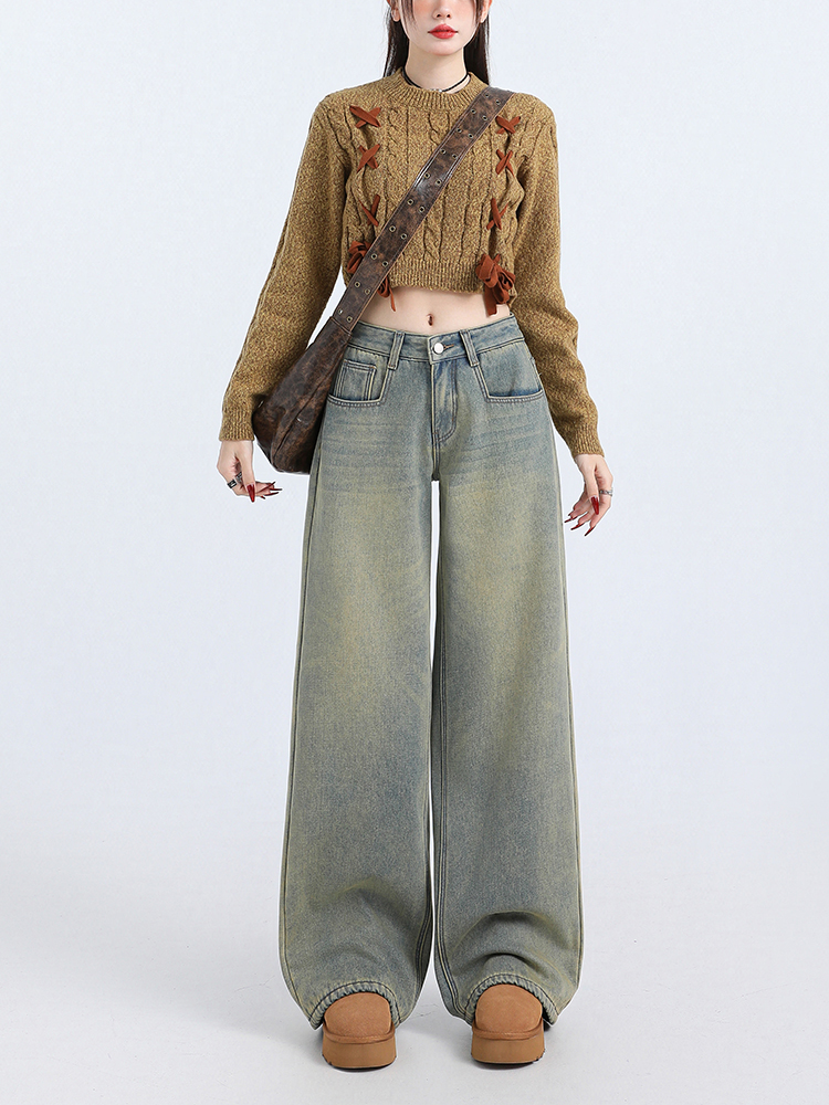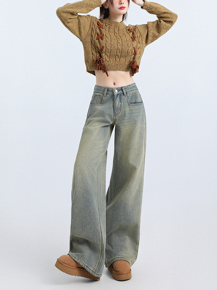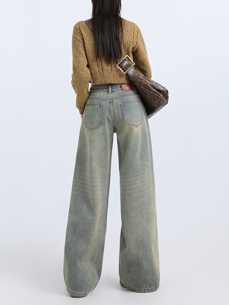 Грязно-желтые выстиранные старые флисовые джинсы, новинка 2025 года, женские, стройнящие, всесезонные, прямые, свободные, широкие брюки