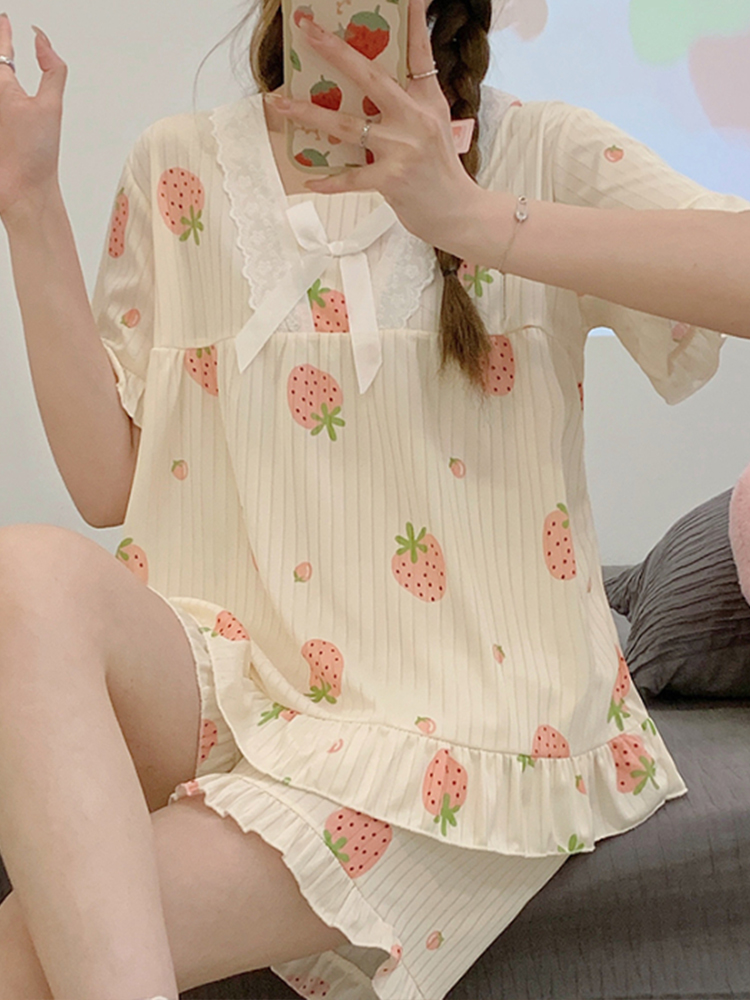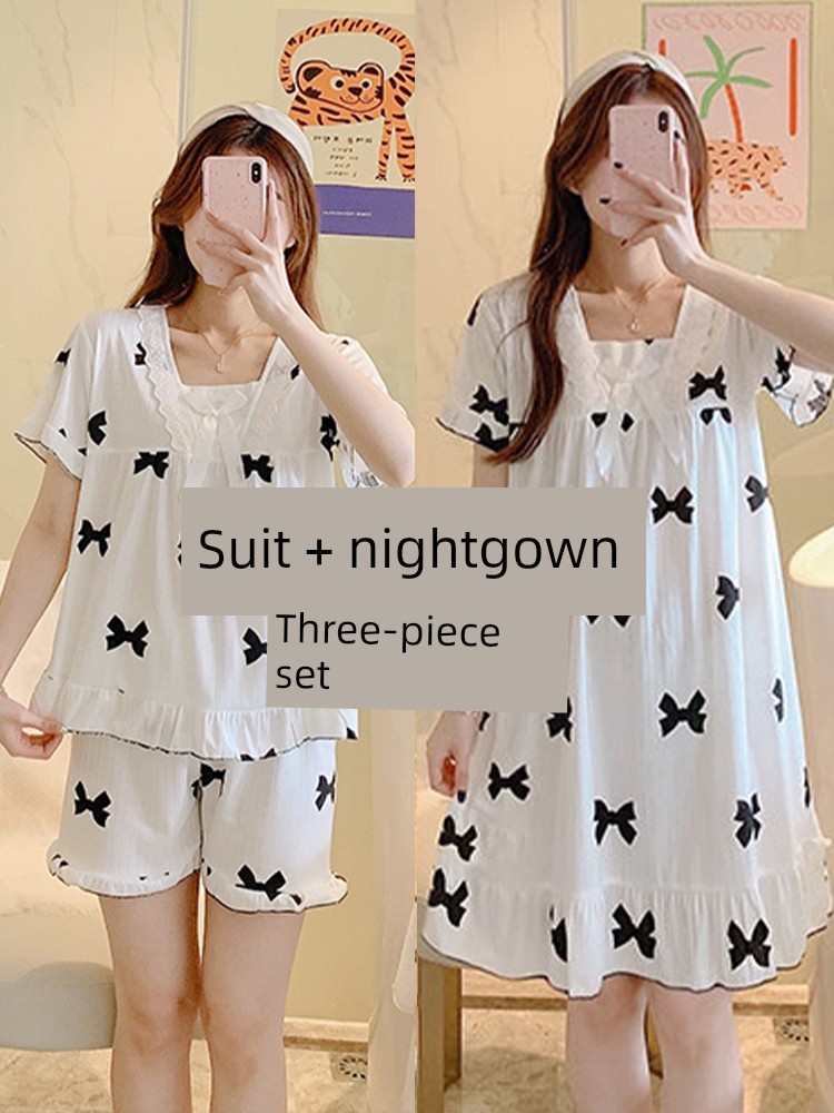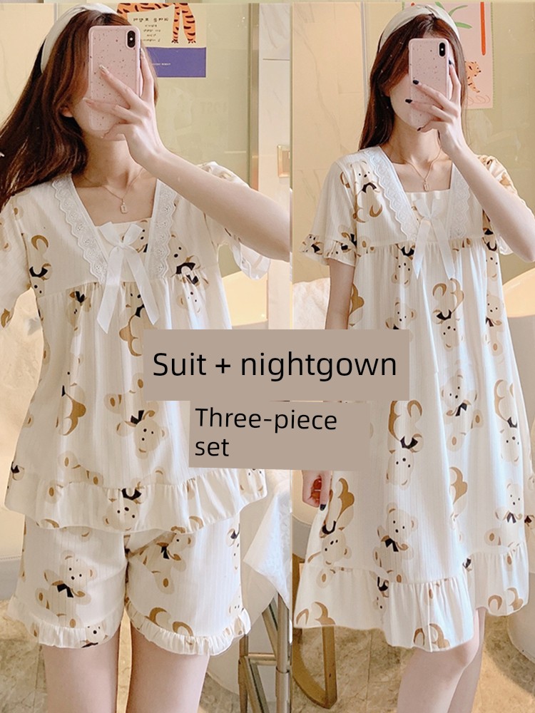 Пижамы Женские летние Комплект из трех предметов с коротким рукавом Брюки Тонкие 2024 Новое поступление Ночная рубашка Женская летняя студенческая домашняя одежда Милая