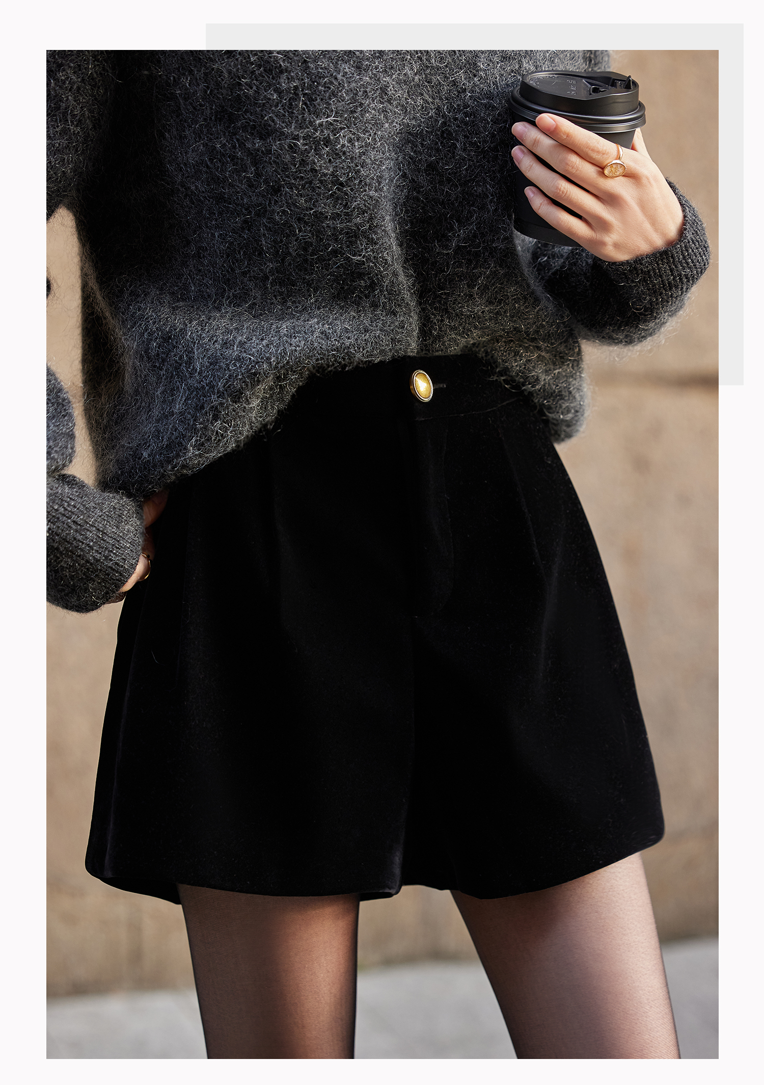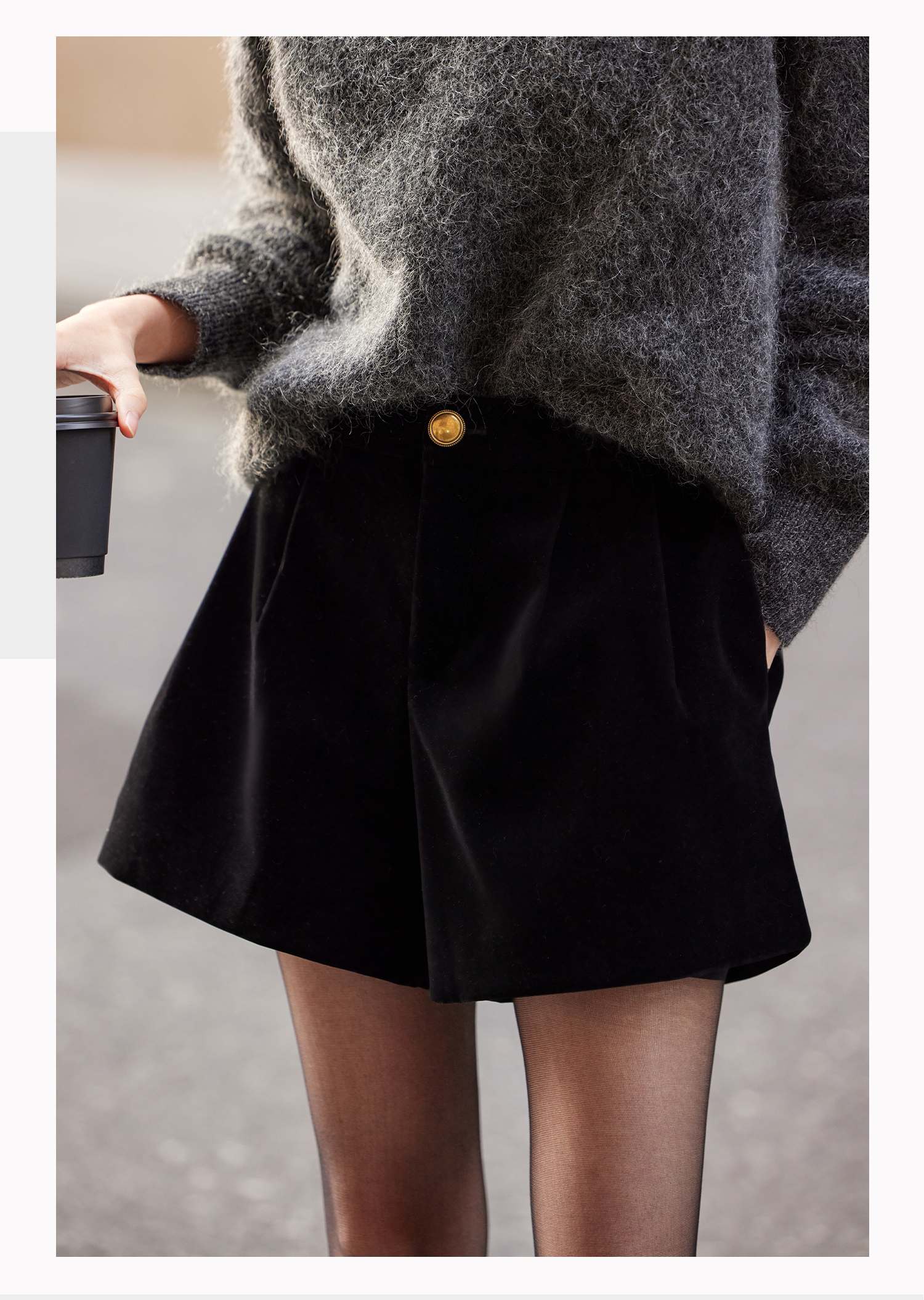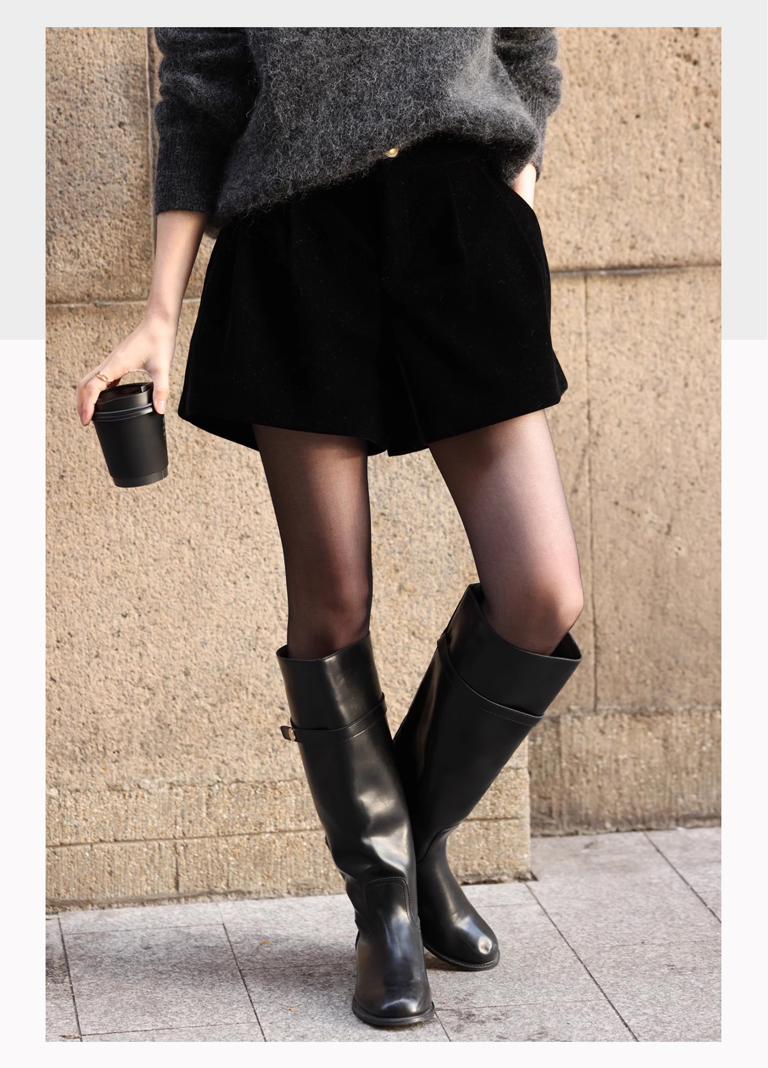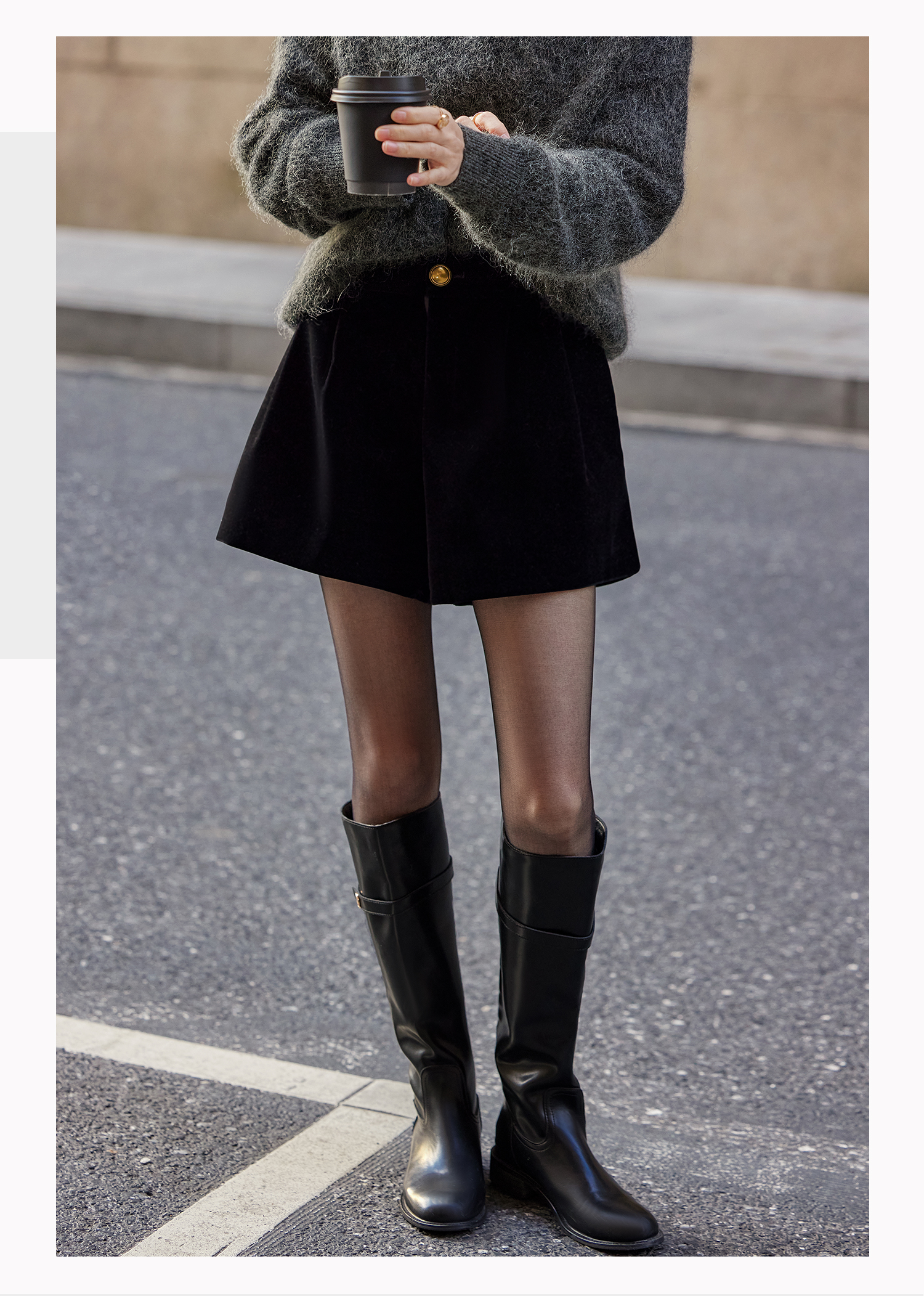 基础款家居服/百家号 外搭靴子 A字型黑色毛呢短裤 2025春季新款女装