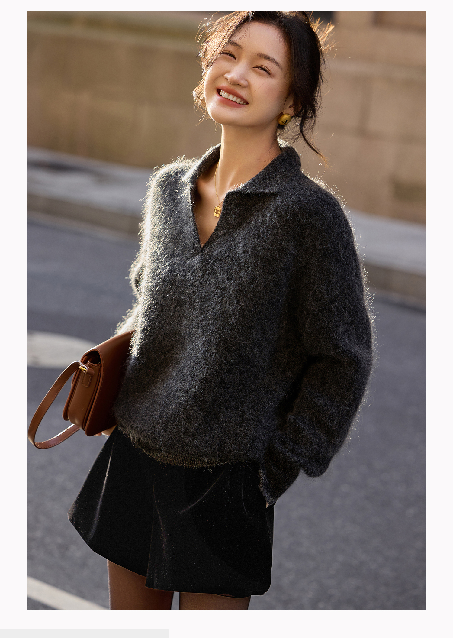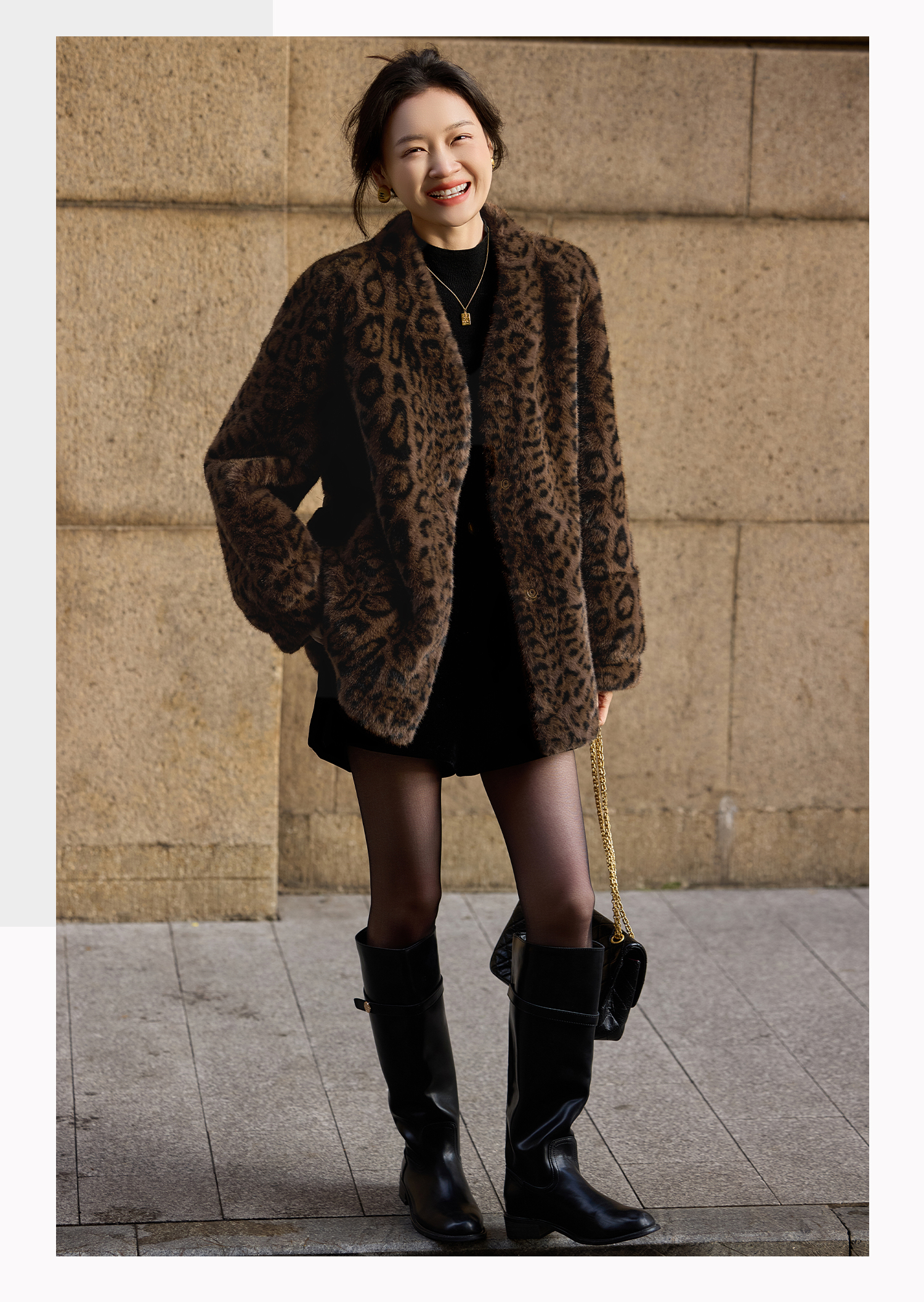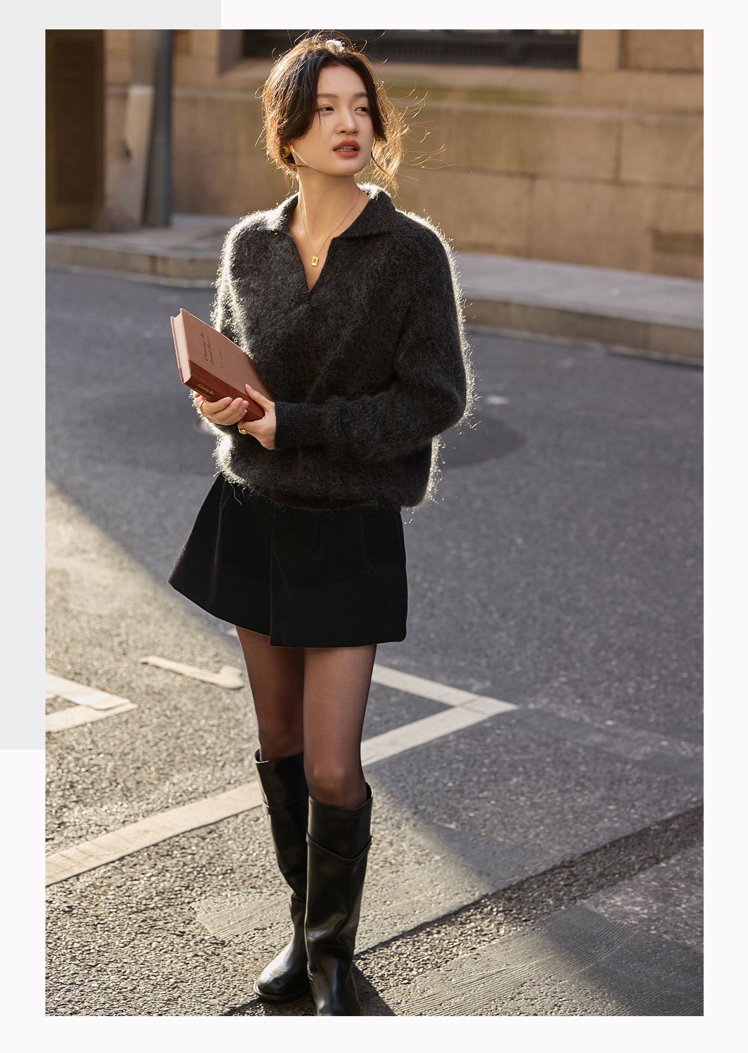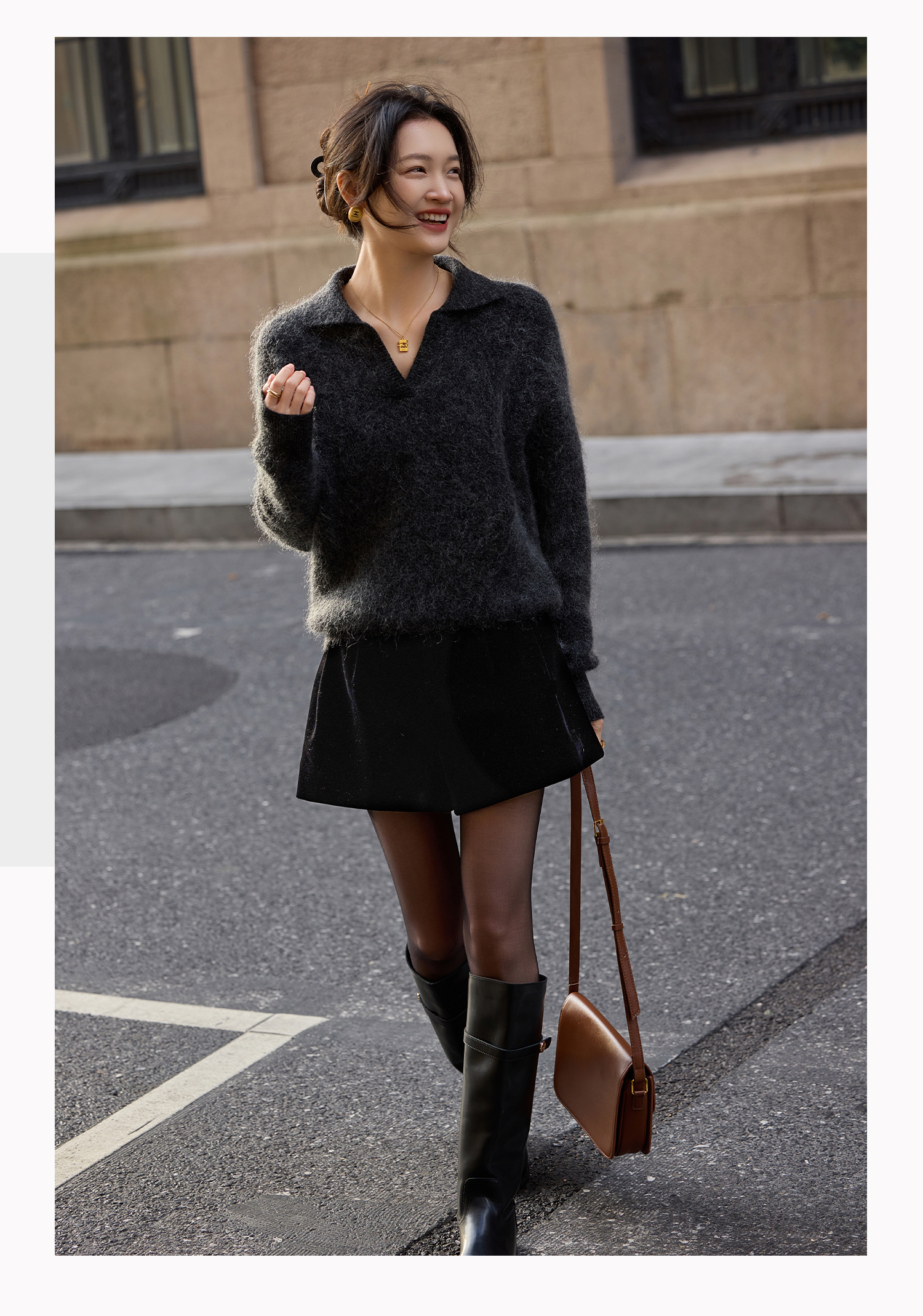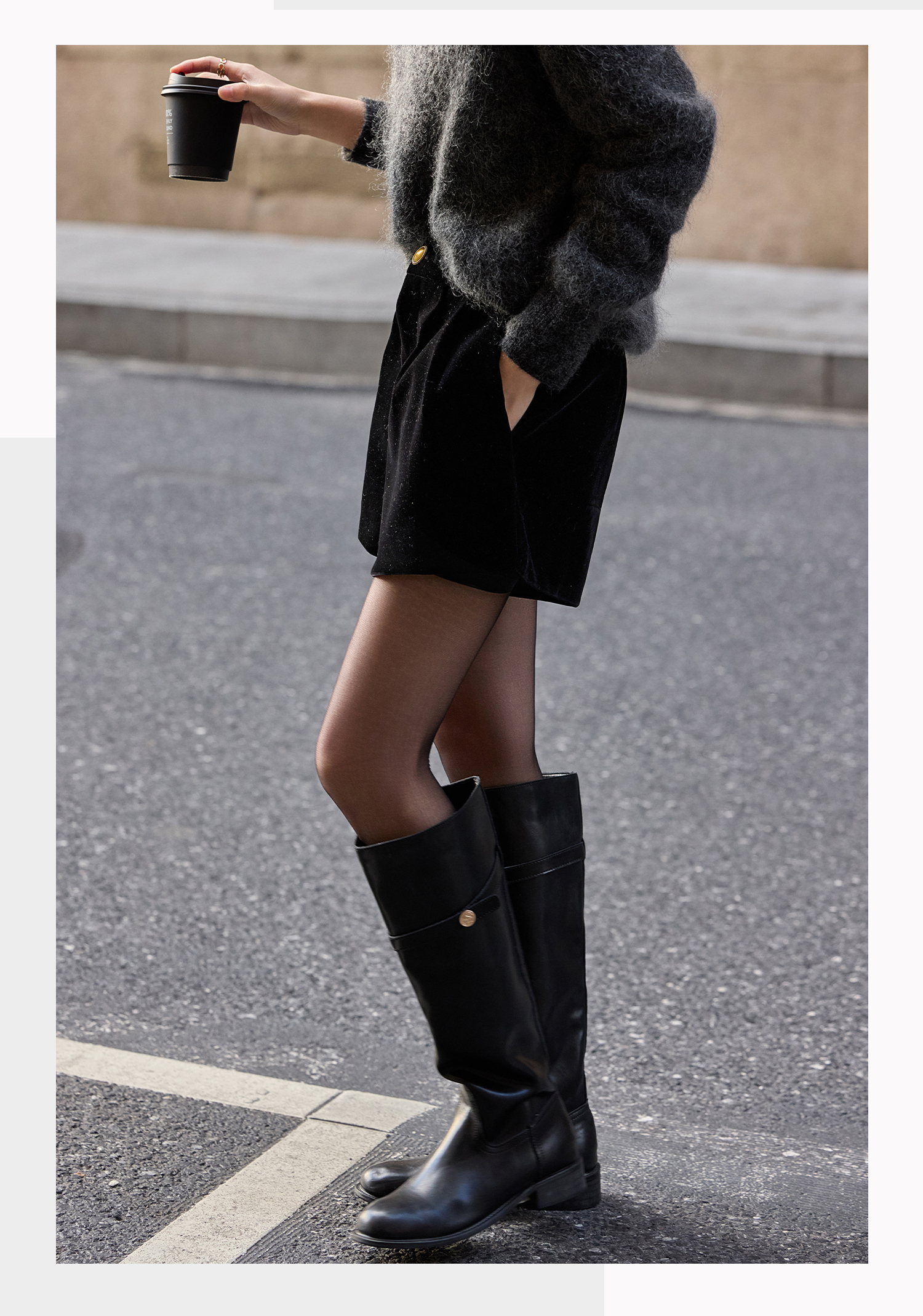 基础款家居服/百家号 外搭靴子 A字型黑色毛呢短裤 2025春季新款女装