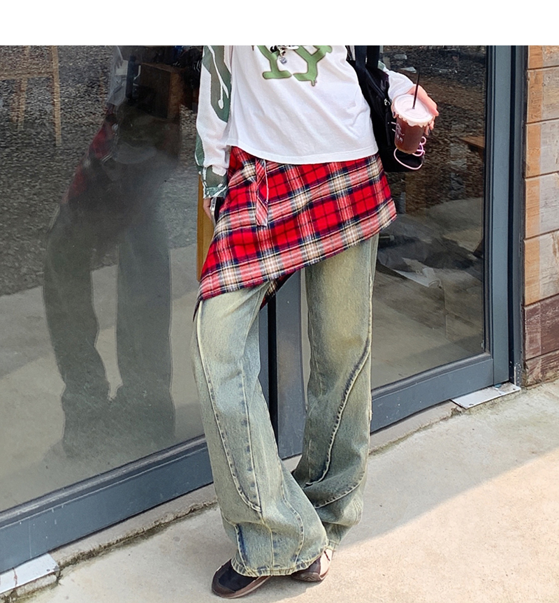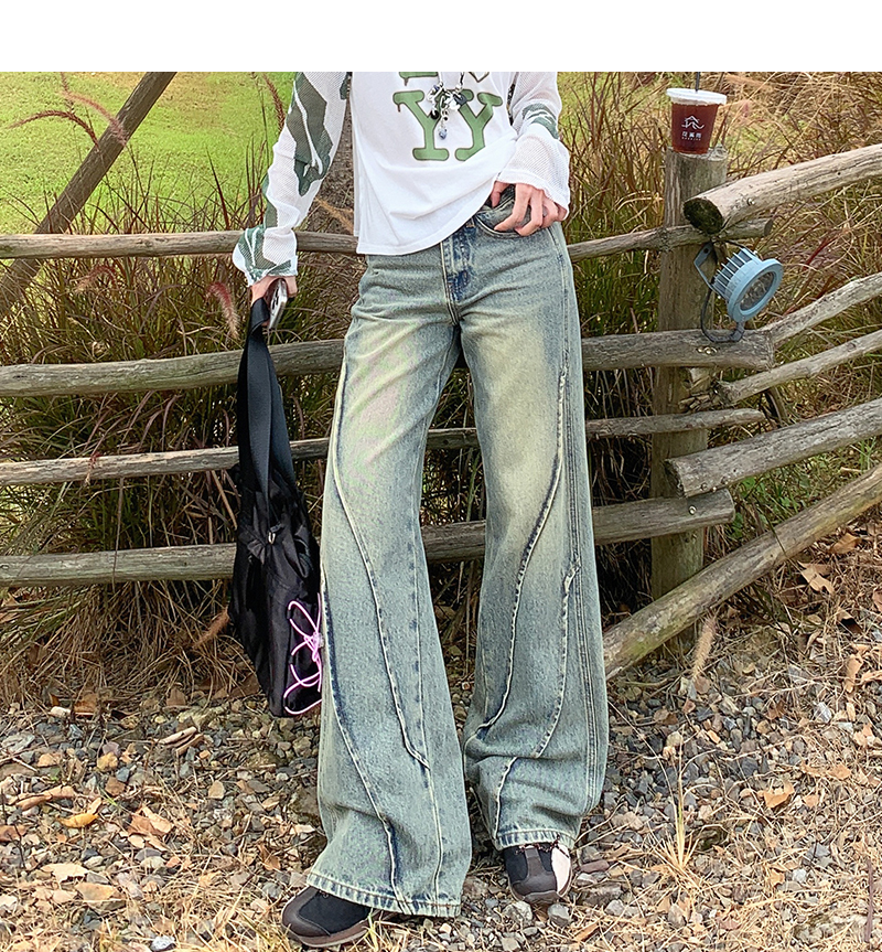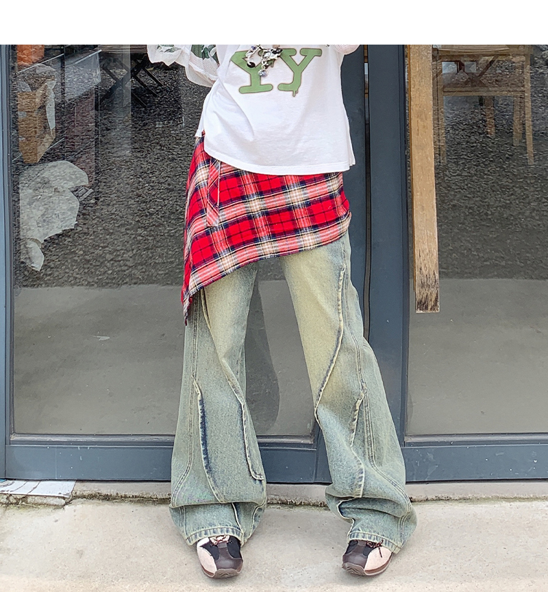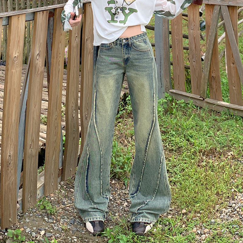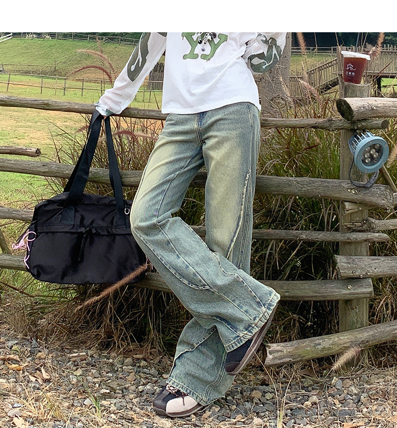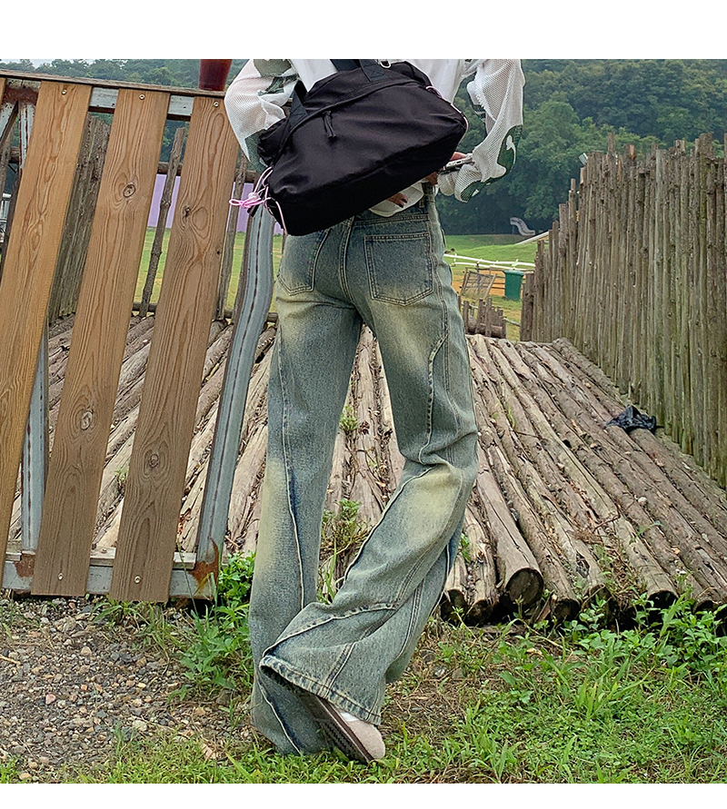 复古做旧拼接不粘脚微喇叭裤 女款 小宽松百搭情侣装直筒阔腿牛仔裤